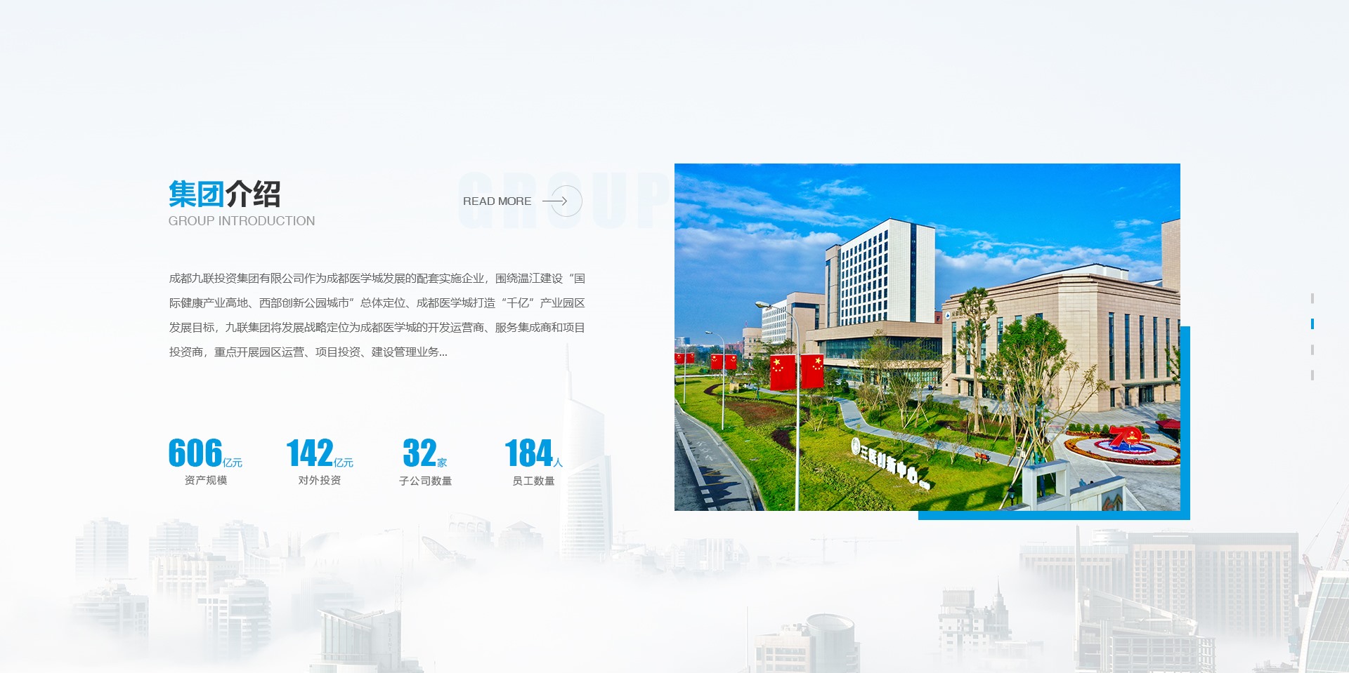 成都九聯投資集團有限公司前身為2000年5月成立的成都??仆顿Y有限責任公司。2013年12月整合全區產業類資產及項目后變更主體為成都九聯投資有限公司,2019年12月完成集團化改造更名為成都九聯投資集團有限公司,是溫江區屬國有獨資公司。作為成都醫學城發展的配套實施企業,圍繞溫江建設“國際健康產業高地、西部創新公園城市”總體定位、成都醫學城打造“千億”產業園區發展目標,九聯集團將發展戰略定位為成都醫