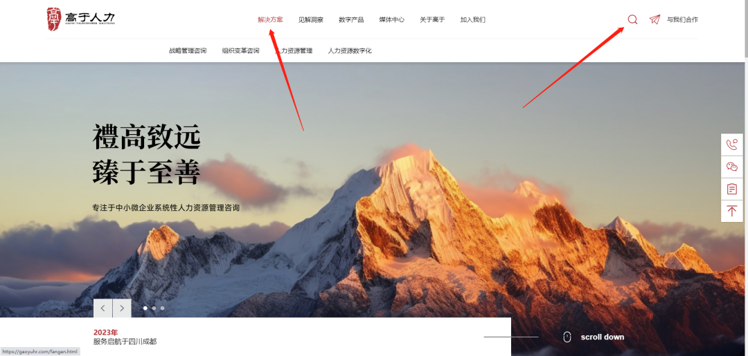 “解決方案”分為“戰略管理咨詢、組織變革咨詢、人力資源管理、人力資源數字化”采用“圖片卡”和“圖文合擺”形式圖文并茂地宣介公司核心業務群組,讓“禮”盡在掌握!