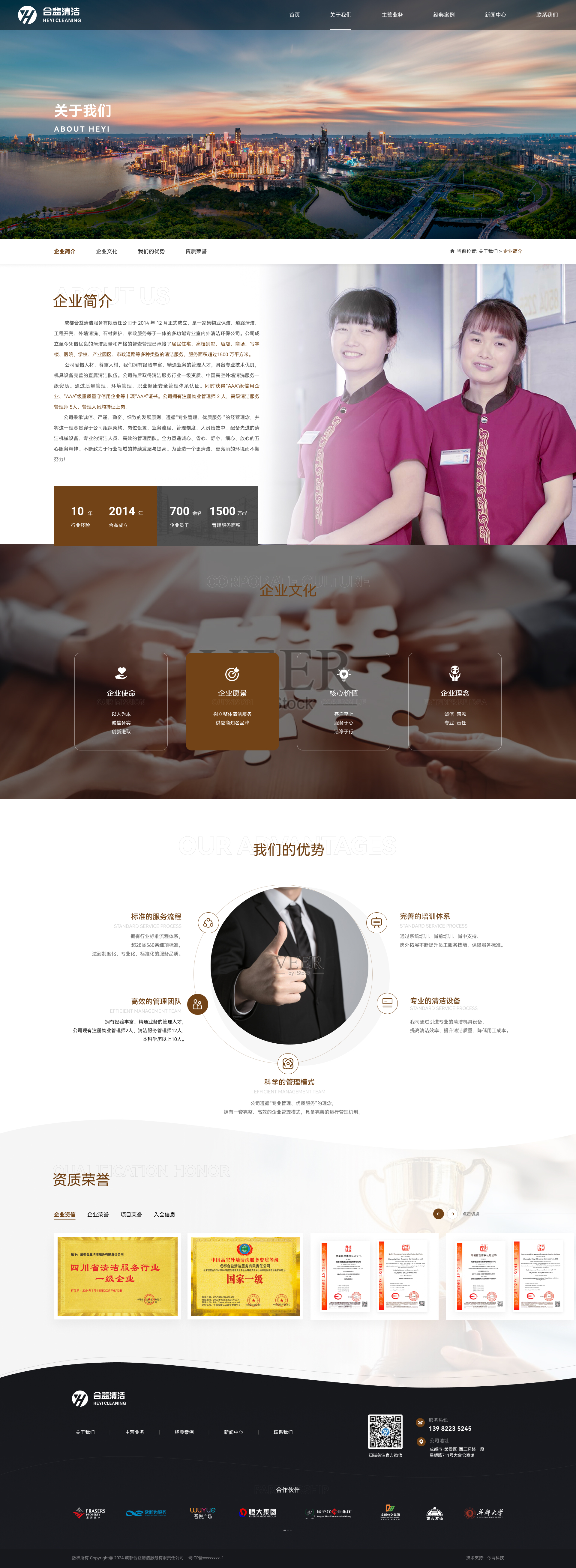 成都合益清潔服務有限責任公司于 2014 年 12 月正式成立,是一家集物業保潔、道路清潔、工程開荒、外墻清洗、石材養護、家政服務等于一體的多功能專業室內外清潔環保公司。公司成立至今憑借優良的清潔質量和嚴格的督查管理已承接了居民住宅、高檔別墅、酒店、商場、寫字樓、醫院、學校、產業園區、市政道路等多種類型的清潔服務,服務面積超過1500 萬平方米。
