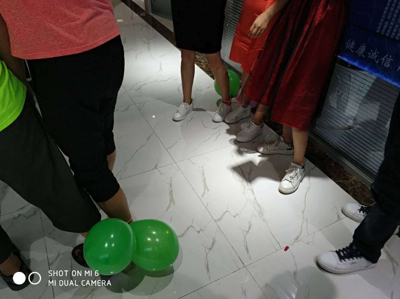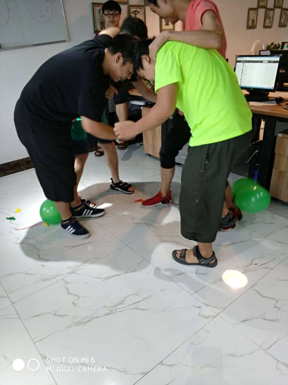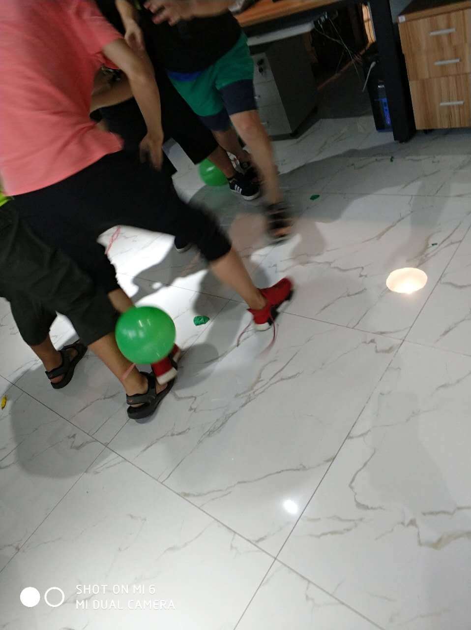 時間過得相當?shù)目欤唤?jīng)意就來到了最后一個環(huán)節(jié),踩氣球。兩隊每兩個成員綁上氣球,相互對抗,踩爆他的球~~~噢!!!小編似乎看到了一場血雨腥風。