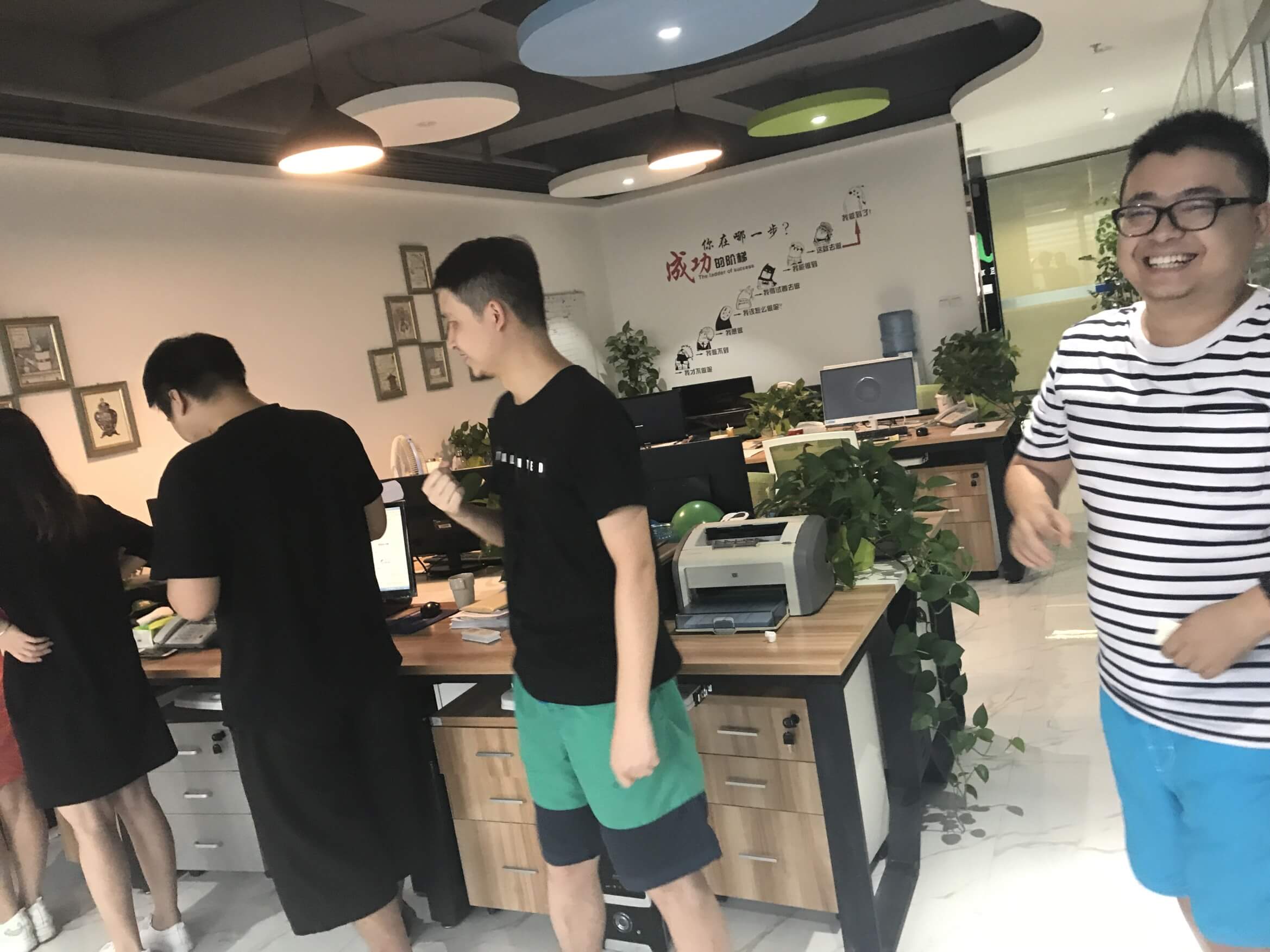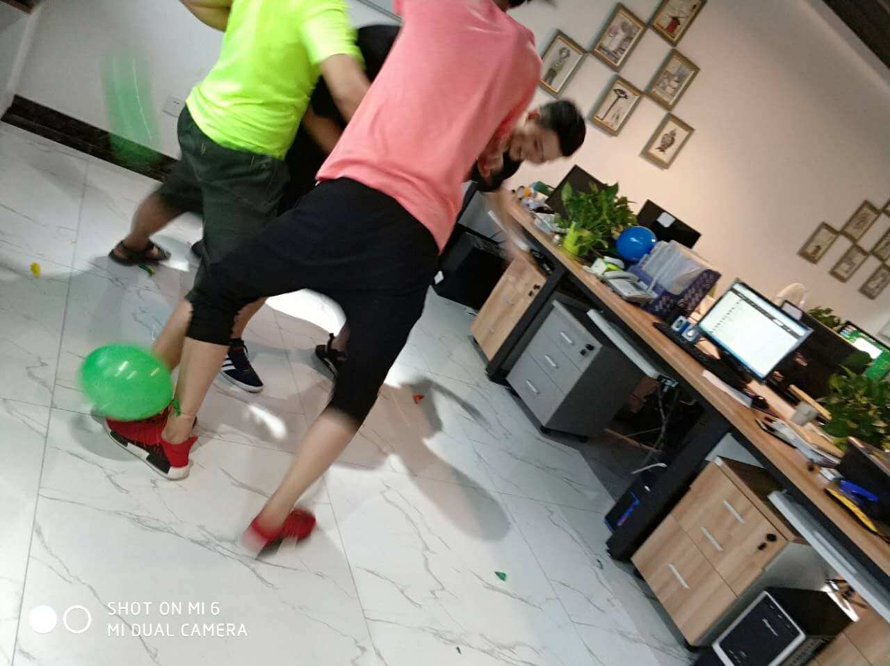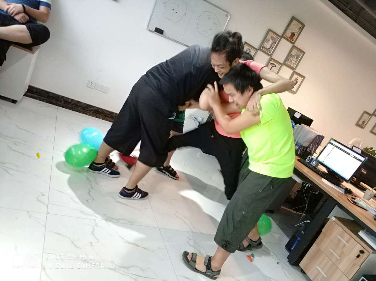 時間過得相當?shù)目欤唤?jīng)意就來到了最后一個環(huán)節(jié),踩氣球。兩隊每兩個成員綁上氣球,相互對抗,踩爆他的球~~~噢!!!小編似乎看到了一場血雨腥風。